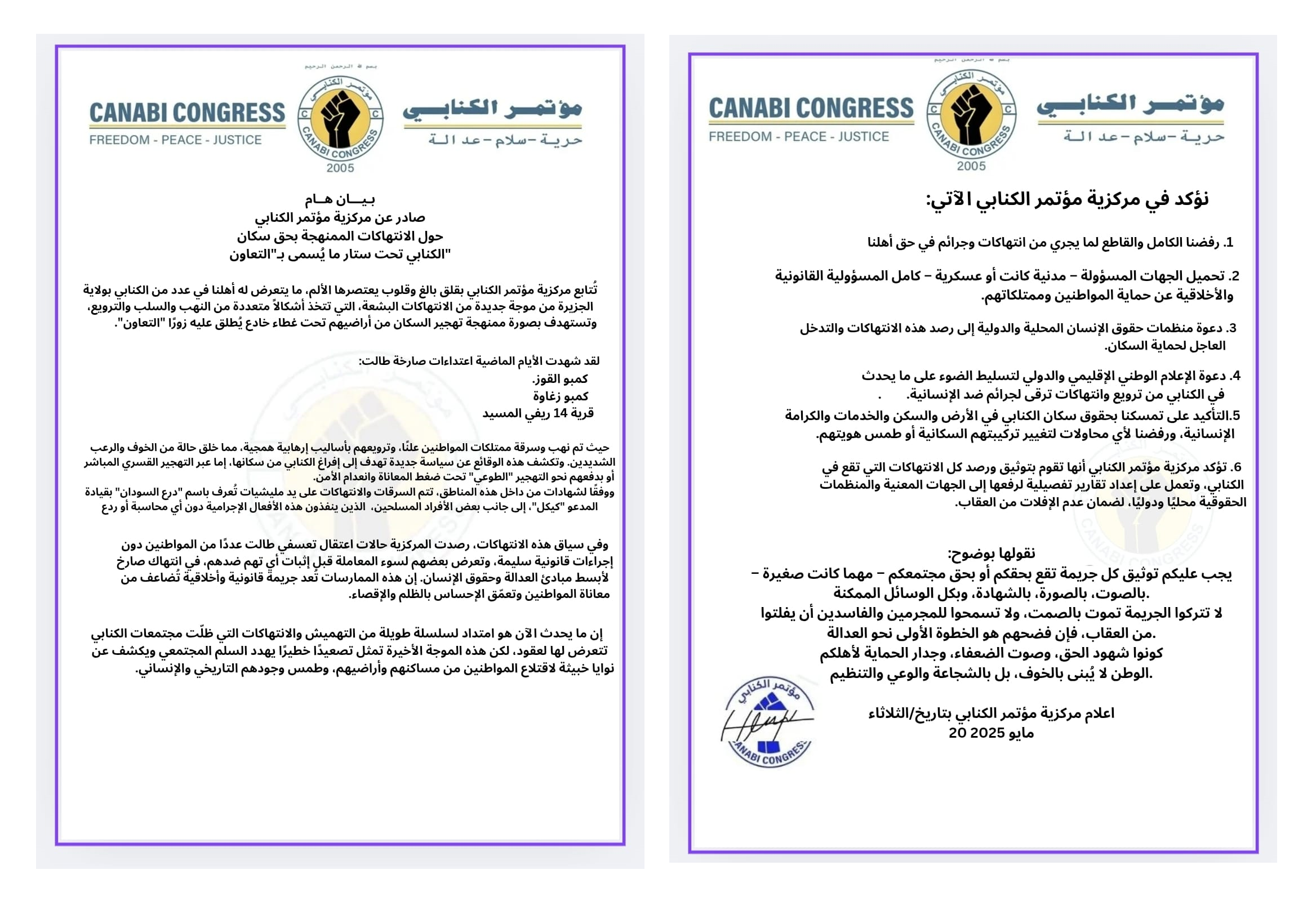 The Al-Kanabi Conference Center is following with deep concern and hearts filled with pain the new wave of horrific violations being experienced by our people in several Al-Kanabi communities in Al-Jazeera State. These violations take various forms, including looting, theft, and intimidation, and are systematically aimed at displacing residents from their lands under the deceptive guise of "cooperation."