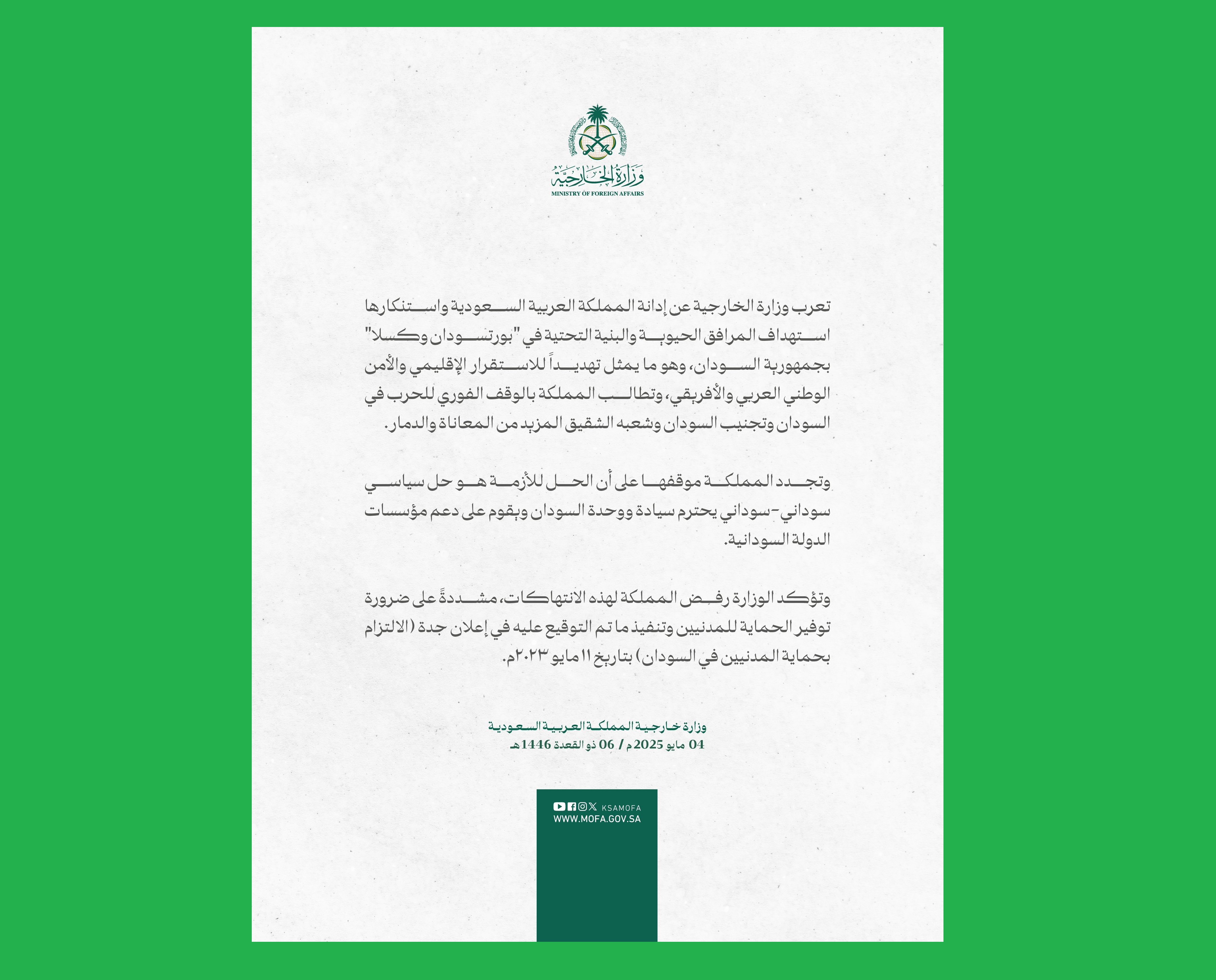 Statement: The Ministry of Foreign Affairs expresses the Kingdom of Saudi Arabia's condemnation and denunciation of the targeting of vital installations and infrastructure in Port Sudan and Kassala in the Republic of Sudan, which poses a threat to regional stability and Arab and African national security.