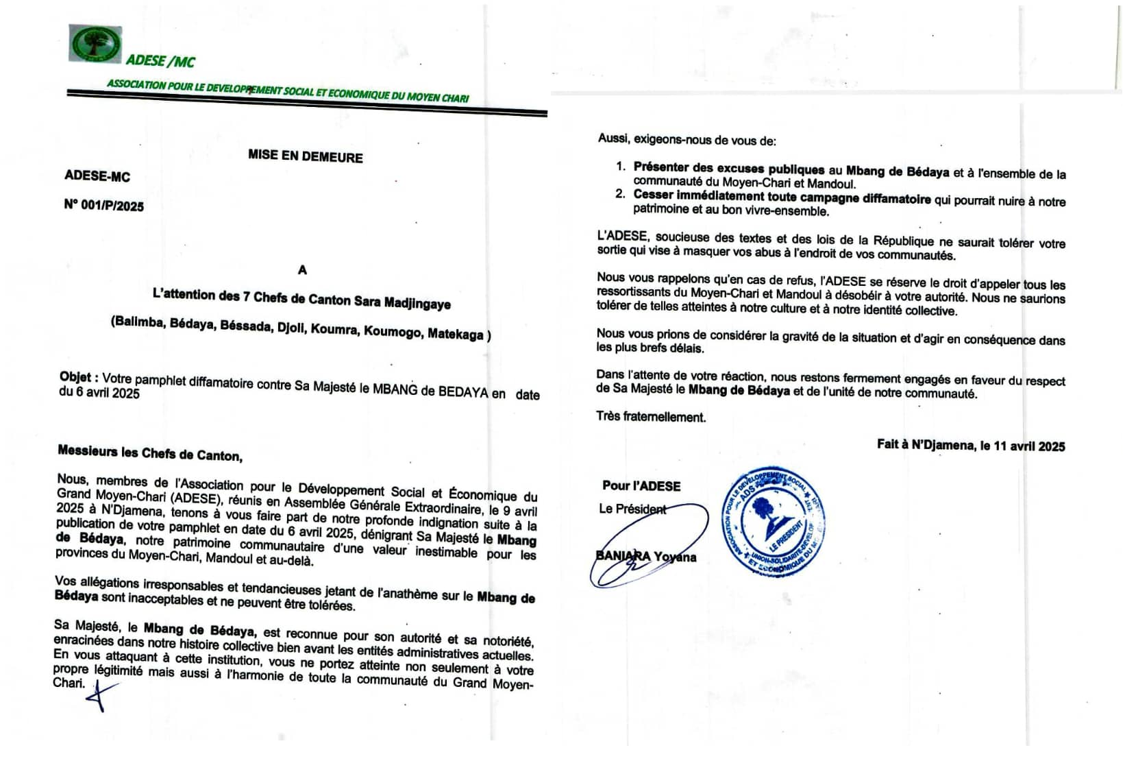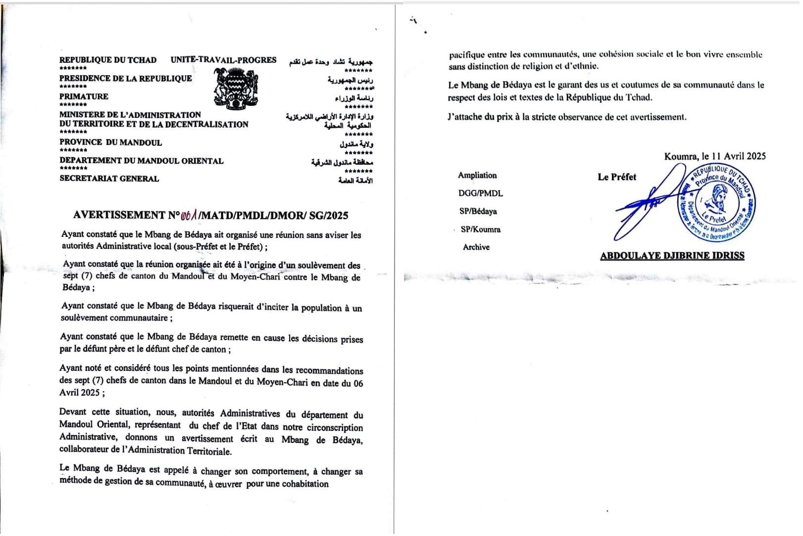 Sa Majesté Nguemadjita Mbangndibaye, le Mbang de Bédaya, tout nouveau roi et garant des traditions Sara, fait face à des menaces et intimidations officielles. Selon une source fiable, Abdoulaye Djibrine Idriss, préfet de Koumra, a émis une note d’avertissement datée du 11 avril 2025. Cette décision fait suite à l’appel du Mbang aux sept chefs de cantons de Saramadjigaye, les exhortant à protéger les lieux sacrés et à ne pas les vendre.